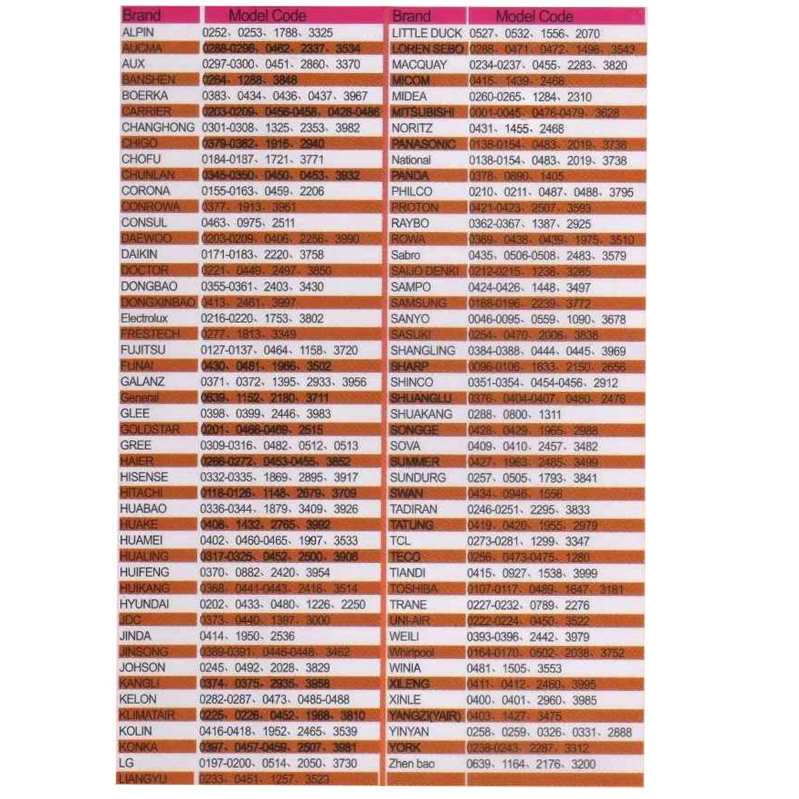 Compatível com: ALPIN, BANSHEN, BOERKA, CARRIER, CHANGHONG, CHIGO, CHOFU, CHUNLAN, CORONA, CONROWA, CONSUL, DEEWOO, DAIKIN, DOCTOR, DONGBAO, DONGXINBAO, ELECTROLUX, FRESTECH, FUJITSU, FUNAI, GALANZ, GENERAL, GREE, HAIER, HISENSE, HITACHI, HUABAO, HUAKE, HUAMEI, HUALING, HUIFENG, HUIKANG, HYUNDAI, JDC, JINDA, JINSONG, JOHSON, KANGU, KELON, KUMATAIR, KOLIN, KONKA, LG, LIANGYU, LITTLE DUCK, LOREN SEBO, MACQUAY, MICOM, MIDEA, MITSUBISHI, NORITZ, PANASONIC, NATIONAL, PANDA, PHILCO, PROTON, RAYBO, ROWA, SABRO, SAIJO DENKI, SAMPO, SAMSUNG, SANYO, SASUKI, SHAGLING, SHARP, SHINCO, SHUANGLU, SUMMER, TCL, TOSHIBA, WHIRPOOL, YORK